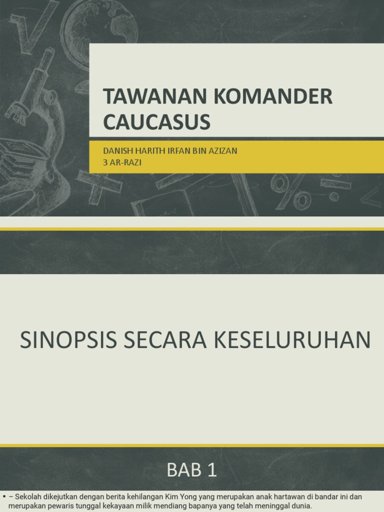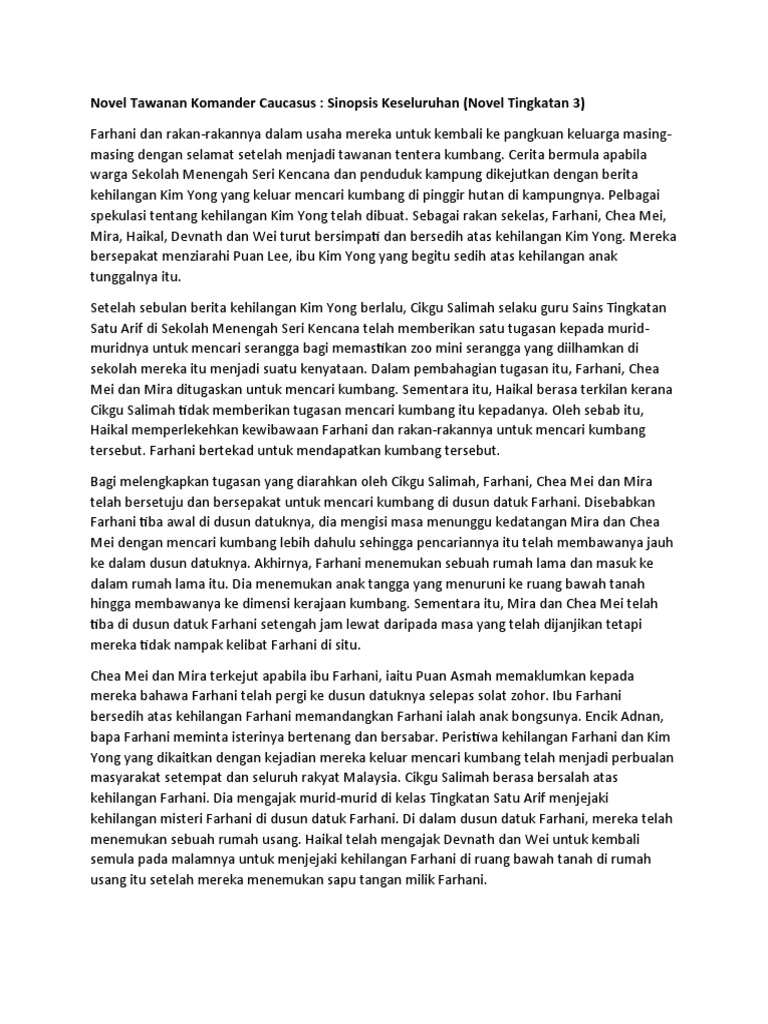 Tawanan Komander Caucasus Sinopsis : February 16, 2017 at 3:55 am ·.. Bab 1:hilang warga sekolah menengah seri kencana dikejutkan dengan berita kehilangan seorang anak hartawan dan pewaris tunggal kekayaan milik mendiang bapanya iaitu kim yong.walaupun kim yong seorang yang bersikap angkuh,farhani tetap. Watak & perwatakan, plot dan nilai pengajaran. Ini ialah video pengenalan bagi modul yang bertajuk komsas: Sinopsis bab tawanan komander caucasus 2 pages 1 13 text version anyflip. Tawanan komander caucasus karya ruzaini yahya sinopsis ialah ringkasan jalan cerita keseluruhan.novel ini mengisahkan sekumpulan remaj yang berani menempuhi.